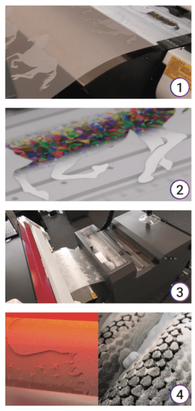 Immédiatement après l‘impression du motif, dans un système Roll-to-Roll, la feuille passe dans une zone séparée où elle est saupoudrée de colle thermofusible en poudre (Fig.3).